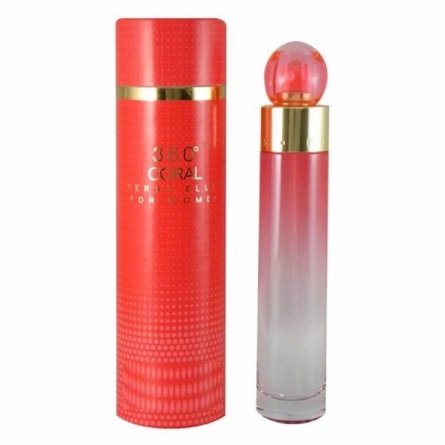 360° Coral de Perry Ellis. 360° Coral se lanzó en 2014. Las Notas de Salida son bergamota, manzana, pera, pimienta rosa y durazno (melocotón); las Notas de Corazón son jazmín, peonía y lirio de los valles (muguete); las Notas de Fondo son madera de cachemira, ámbar, haba tonka y almizcle.
